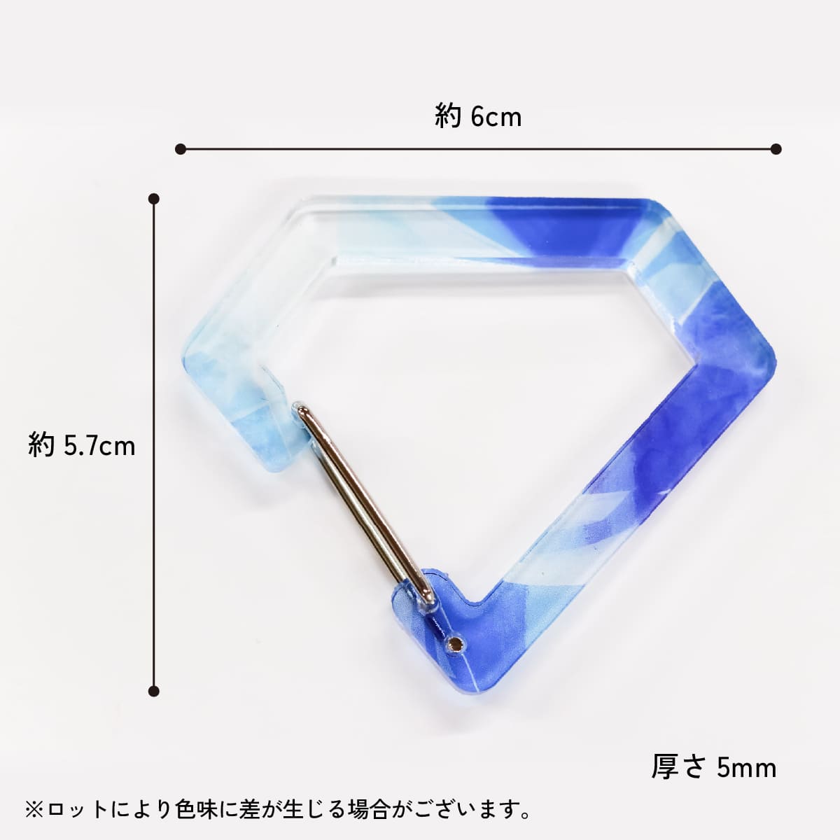 | 注意事項 | カラビナと名前が付いていますが、アクリル製の商品ですので、鍵やキーホルダー等アクセサリーを吊り下げる程度の強度です。アクリルが細くなった部分、特に開閉レバー取り付け部分はさほど強度がありませんので、 貴重品や重量のあるものは吊り下げないようご注意ください。 また、保証期間等は設けておりません。ご使用中の破損におきましては返品対象にはなりませんので丁寧にお使い下さい。