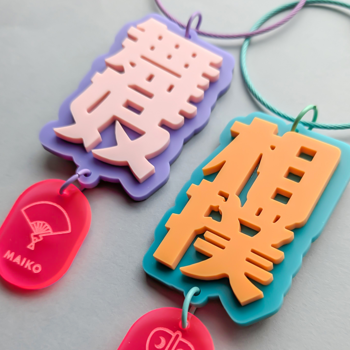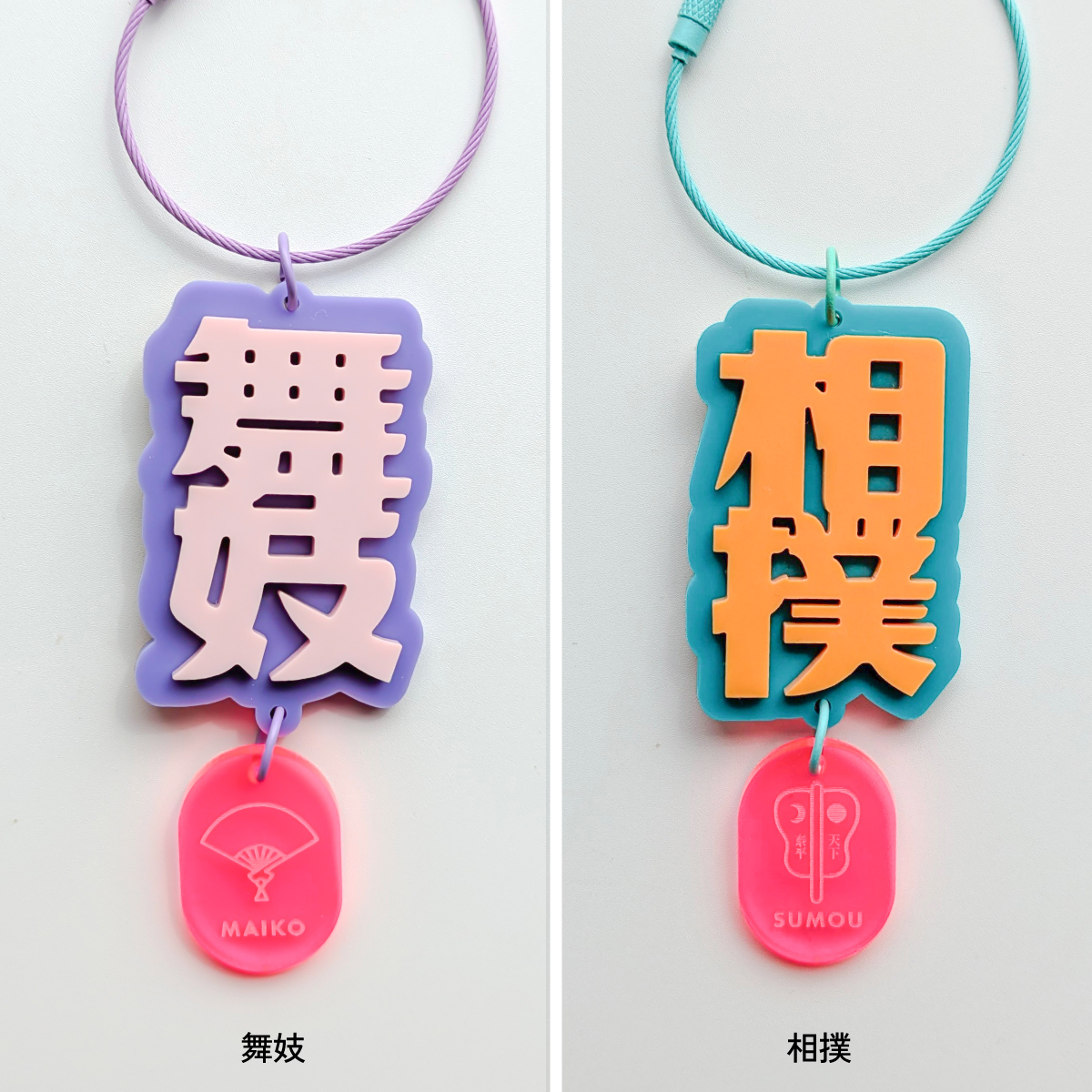 カラフルなアクリルで「舞妓」「相撲」の漢字を立体的に表現。