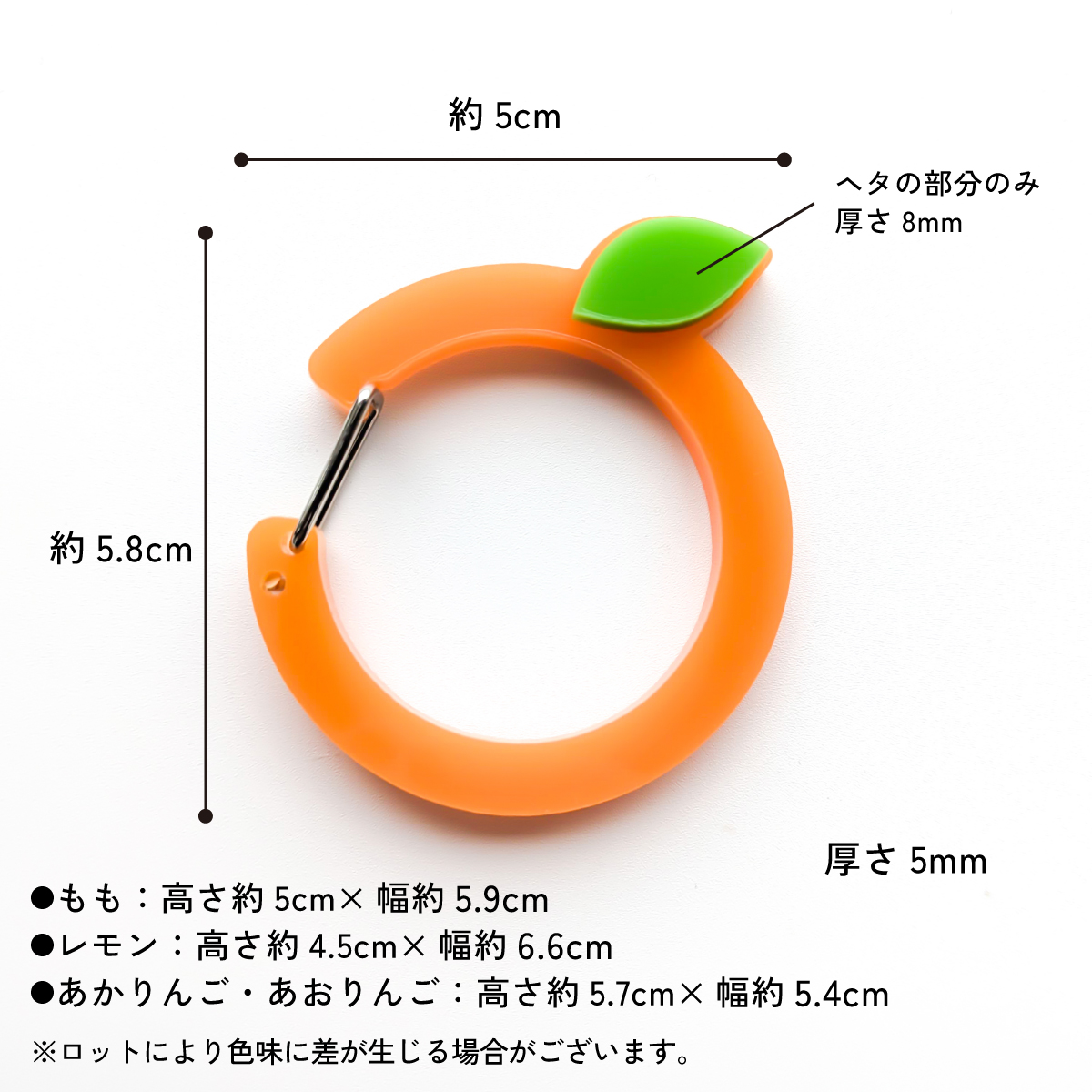 | サイズ | オレンジ:幅約5cm×高さ約5cm、厚さ5mm もも:幅約5.9m×高さ約5cm、厚さ5mm レモン:幅約6.6cm×高さ約4.5cm、厚さ5mm あかりんご・あおりんご:幅約5.4cm×高さ約5.7cm、厚さ5mm |