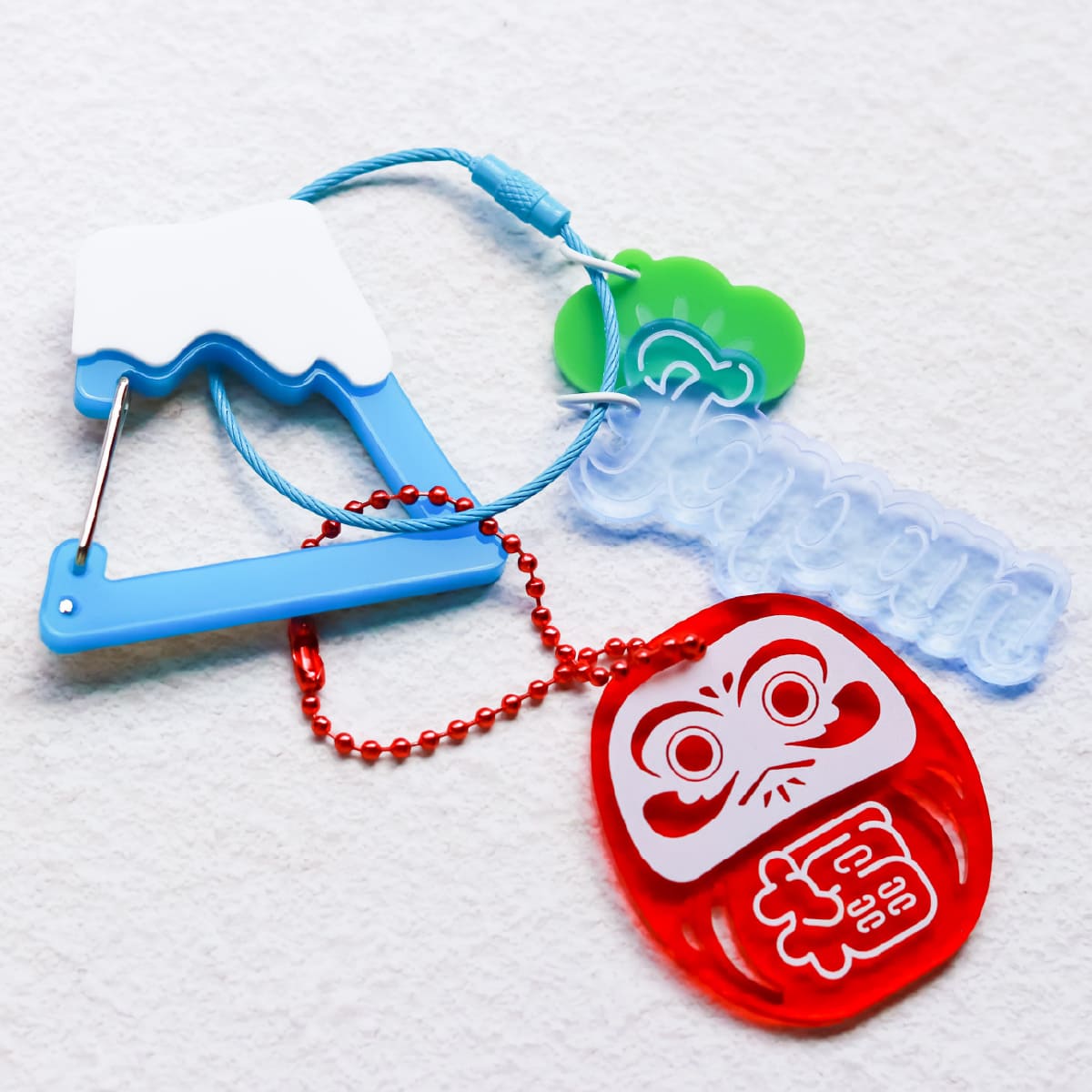 アクリル製の日本を象徴する富士山の形のカラビナキーホルダー。