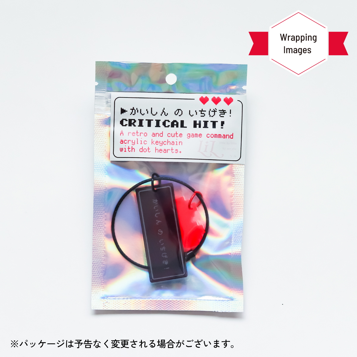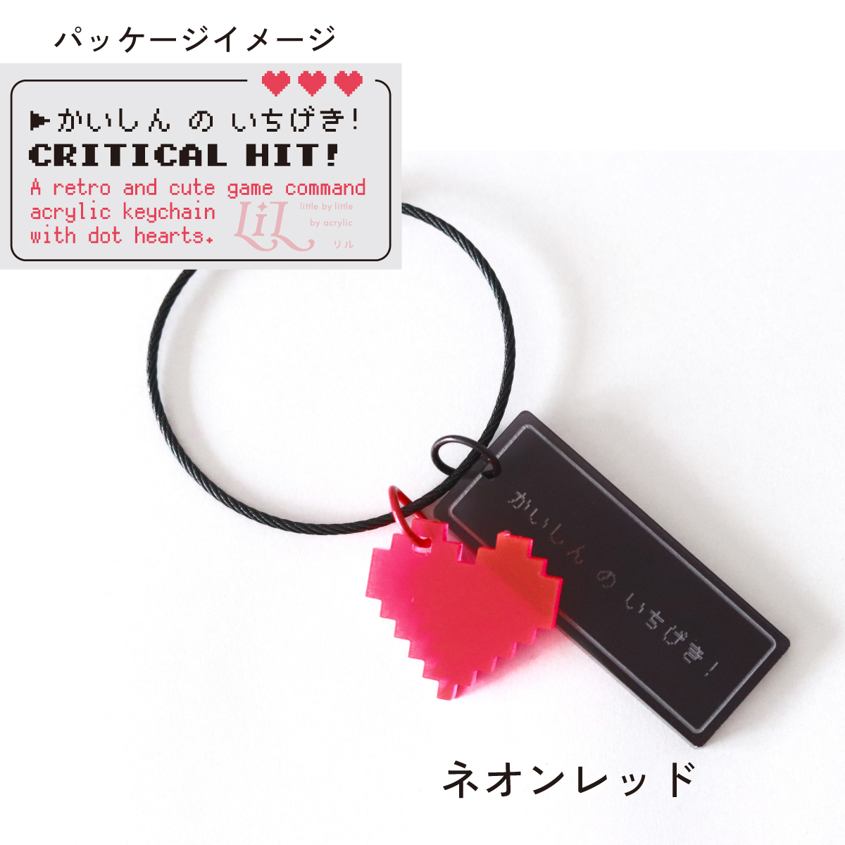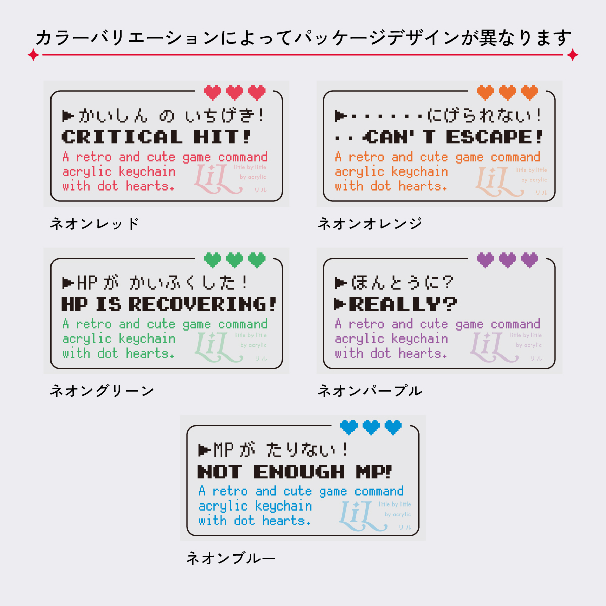 レトロ可愛いゲームコマンド風とドットハート型チャームつきのアクリルキーホルダー。