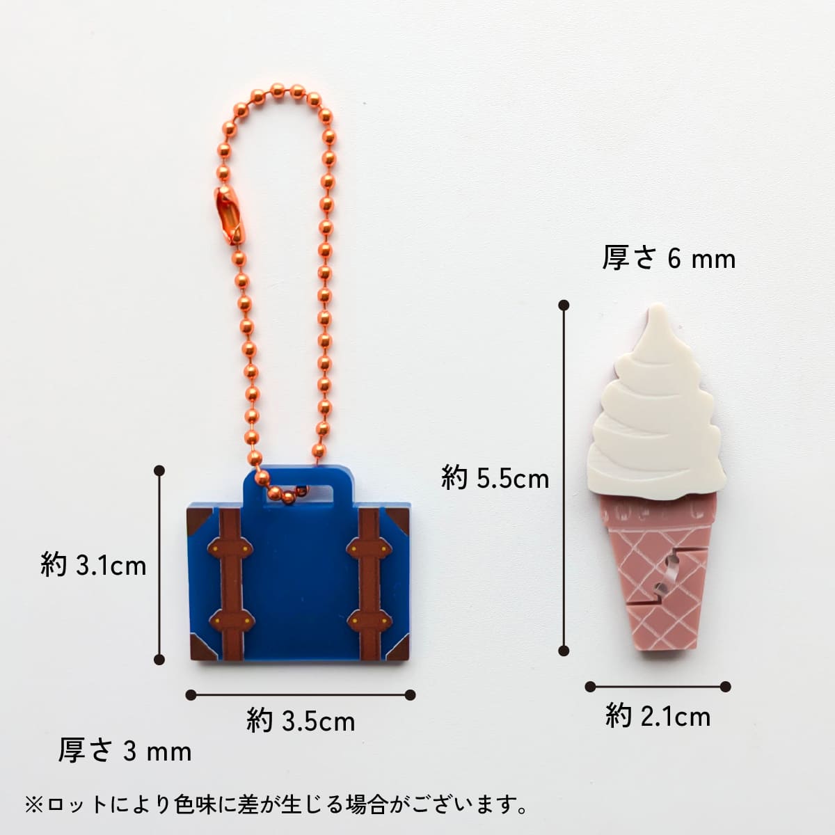| サイズ | ●バッグ 高さ約3.1cm×幅約3.5cm×厚さ3mm ●ソフトクリーム 高さ約5.5cm×幅約2.1cm×厚さ6mm |