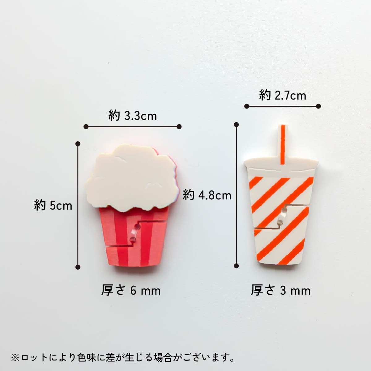 | サイズ | ●ドリンク 高さ約4.8cm×幅約2.7cm×厚さ3mm ●ポップコーン 高さ約5cm×幅約3.3cm×厚さ6mm |