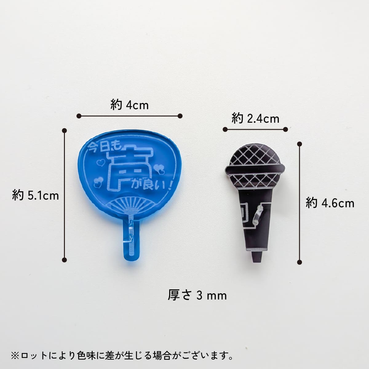 | サイズ | マイク:高さ約4.6cm×幅約2.4cm うちわ:高さ約5.1cm×幅約4cm 厚さ3mm |