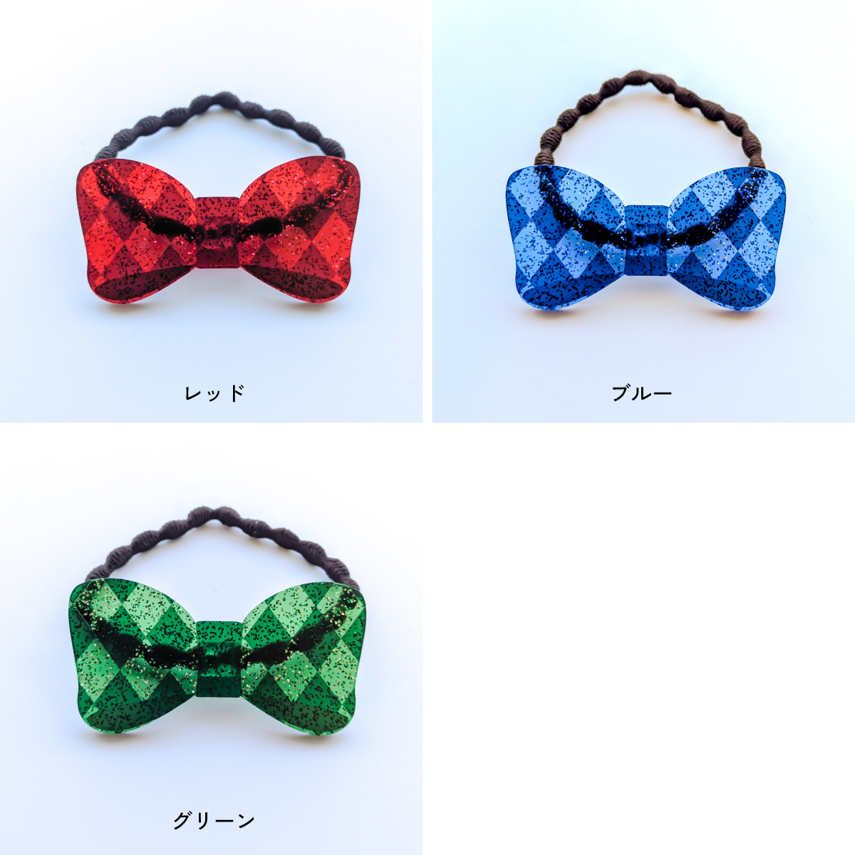 落ち着いたカラーにラメがさりげなく光るリボンのヘアゴムです。