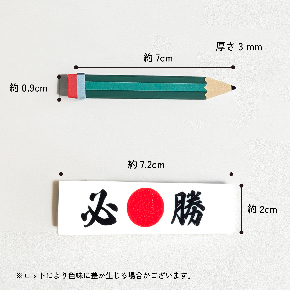| サイズ | ●必勝ハチマキヘアピン 高さ約2cm×幅約7.2cm×厚さ3mm ●えんぴつヘアピン 高さ約0.9cm×幅約7cm×厚さ3mm |