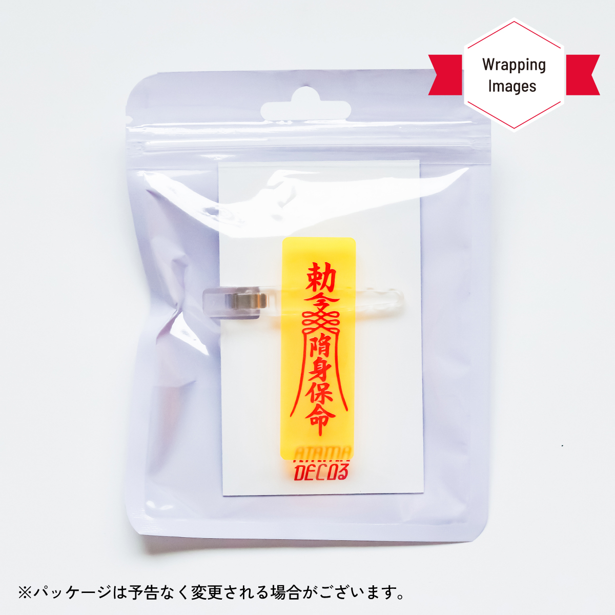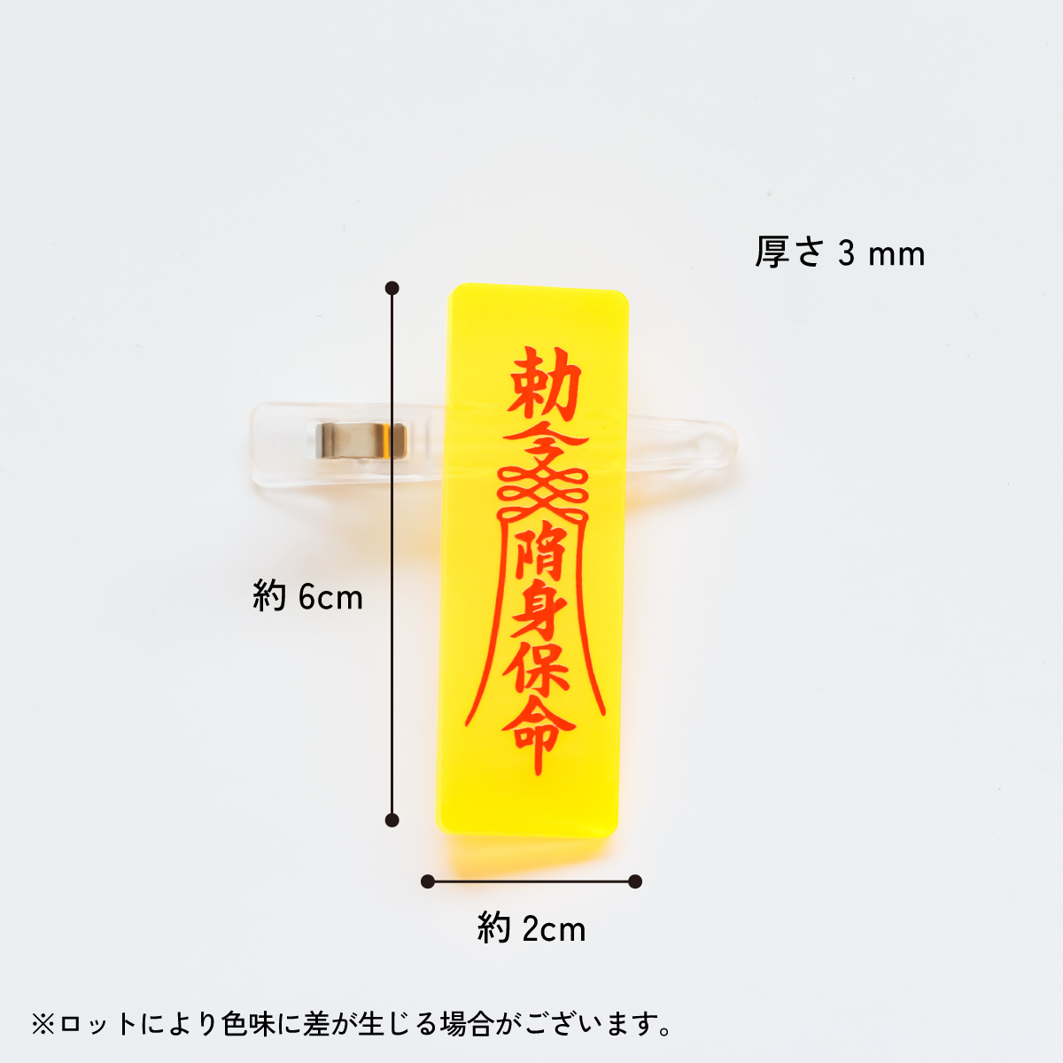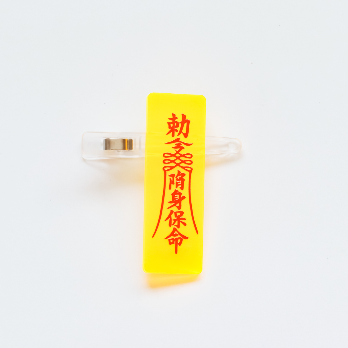 おでこに貼るお札モチーフが目を引く、キョンシーヘアピン。 ネオンカラーのアクリルと文字デザインが、どこか怪しくてポップな存在感を放ちます。 遊び心たっぷりで、コーデのアクセントになるお守り感覚のヘアアクセサリーです。