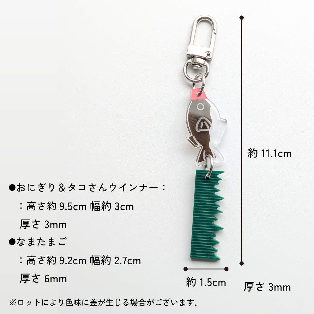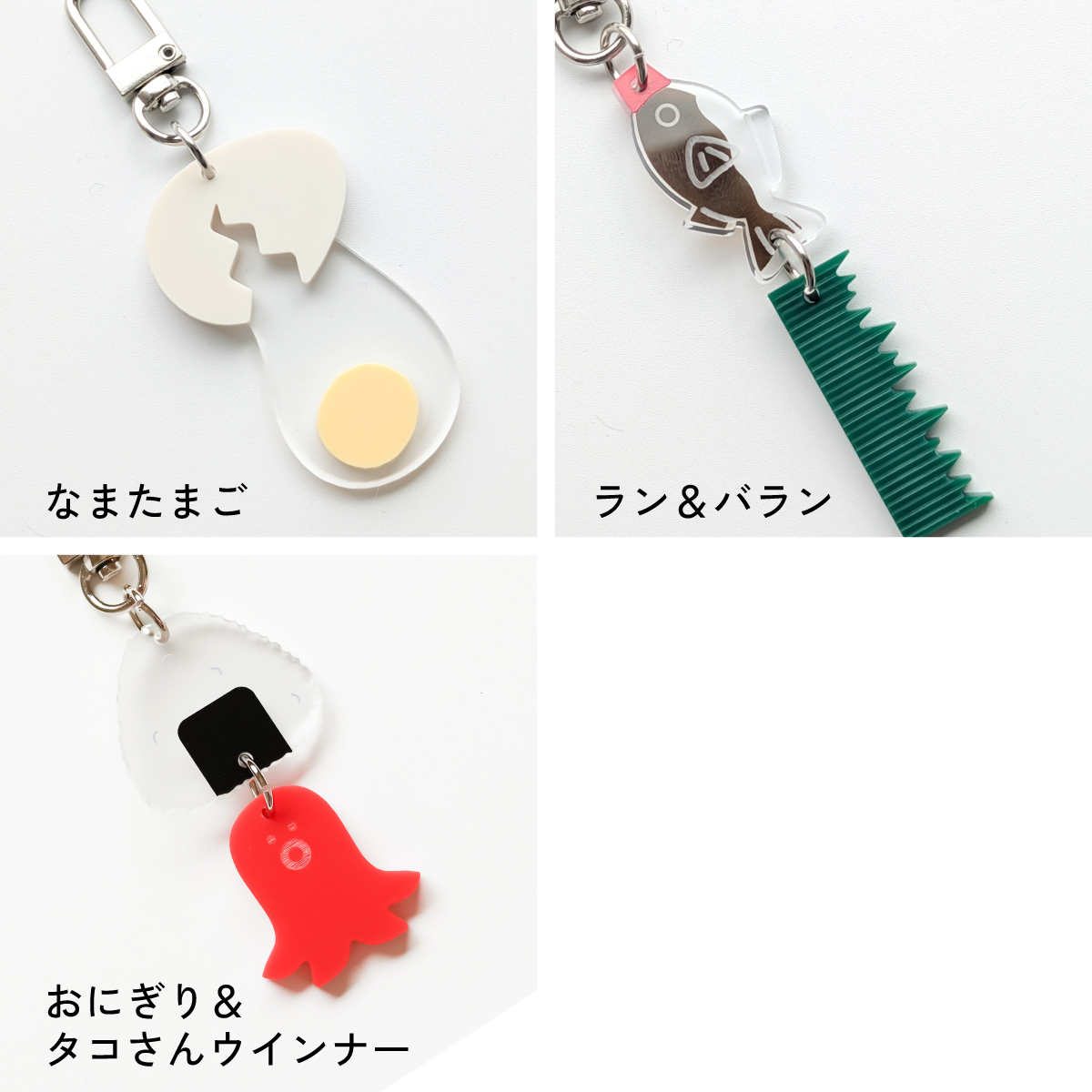 | サイズ | ●ラン&バラン:横約1.5cm×縦約11.1cm×厚さ3mm ●おにぎり&タコさんウインナー:横約3cm×縦約9.5cm×厚さ3mm ●なまたまご:横約2.7cm×縦約9.2cm×厚さ6mm 金具込みのサイズです。 |