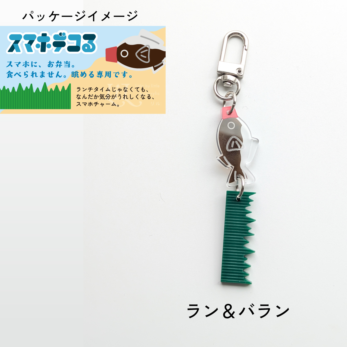魚モチーフと、バラン風のチャームがセットになった遊び心あふれるデザイン。