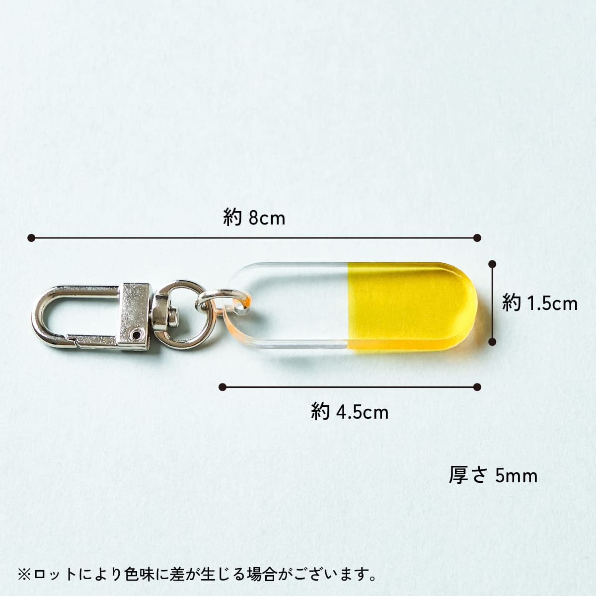 お薬のカプセルを模したアクリルキーホルダー。推し活にもピッタリのかわいいキーホルダー。推しという存在は自分を元気にしてくれるおくすりでありビタミン。見ているだけで元気がもらえちゃう、さりげなくワンポイントとして使えるキーホルダー。16色から選べるので、メンバーカラー、推しカラーを選んで視覚的にアピールできる。推し友達にも自慢できちゃう!? ちょっと楽しくなるキーホルダーです。