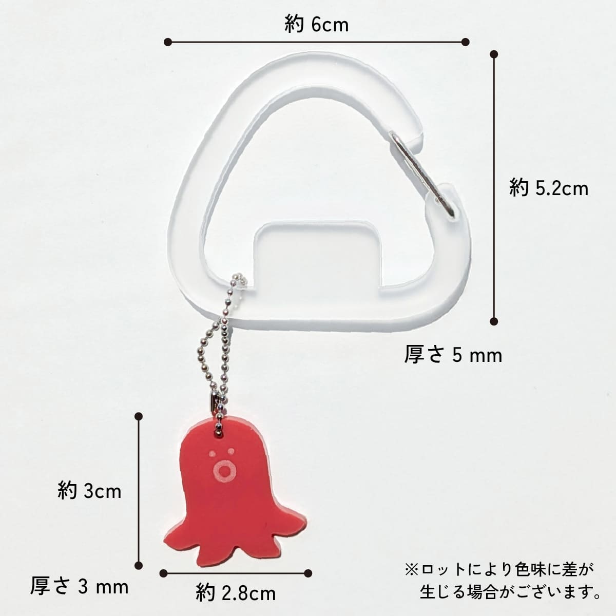 | サイズ | ●おにぎりカラビナ 高さ約5.2cmm×幅約6cm 厚さ 5mm ●タコさんウインナーチャーム 高さ約3cm×幅約2.8cm 厚さ 3mm |