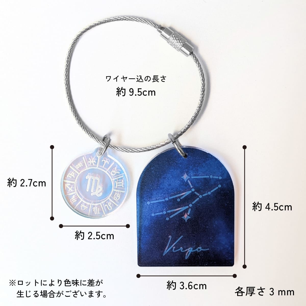 | サイズ | ●星座キーホルダー 高さ約4.5cm×幅約3.6cm ●星座まるチャーム 高さ約2.7cm×幅約2.5cm ワイヤー込みの長さ:約9.5cm 厚さ 3mm |